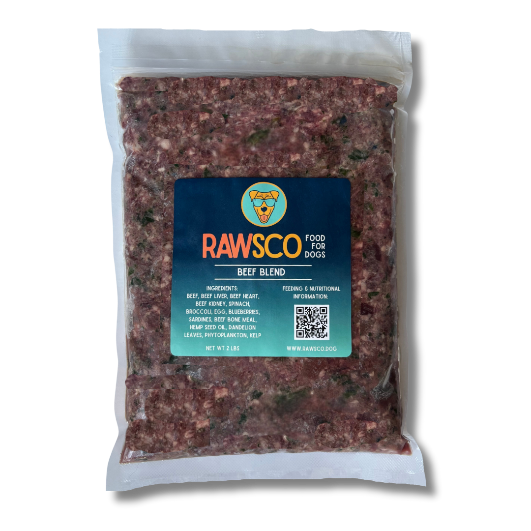 - Complete dog diet with lean ground beef, beef organs, fish, fruits and vegetables, and whole food supplemental oils and powders.